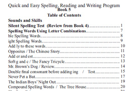 Book 5 reviews words taught in Books 1, 2, 3, and 4. First the students take the silent spelling test learning words taught in categories such as months. When these words are mastered, the student is introduced to more complex grammar rules such as changing the f to v and adding es and homophones such as they’re, their and there. Dictation paragraphs and stories are used to teach 25 grammar rules including letter writing and multisyllabic words such as transportation and imagination.